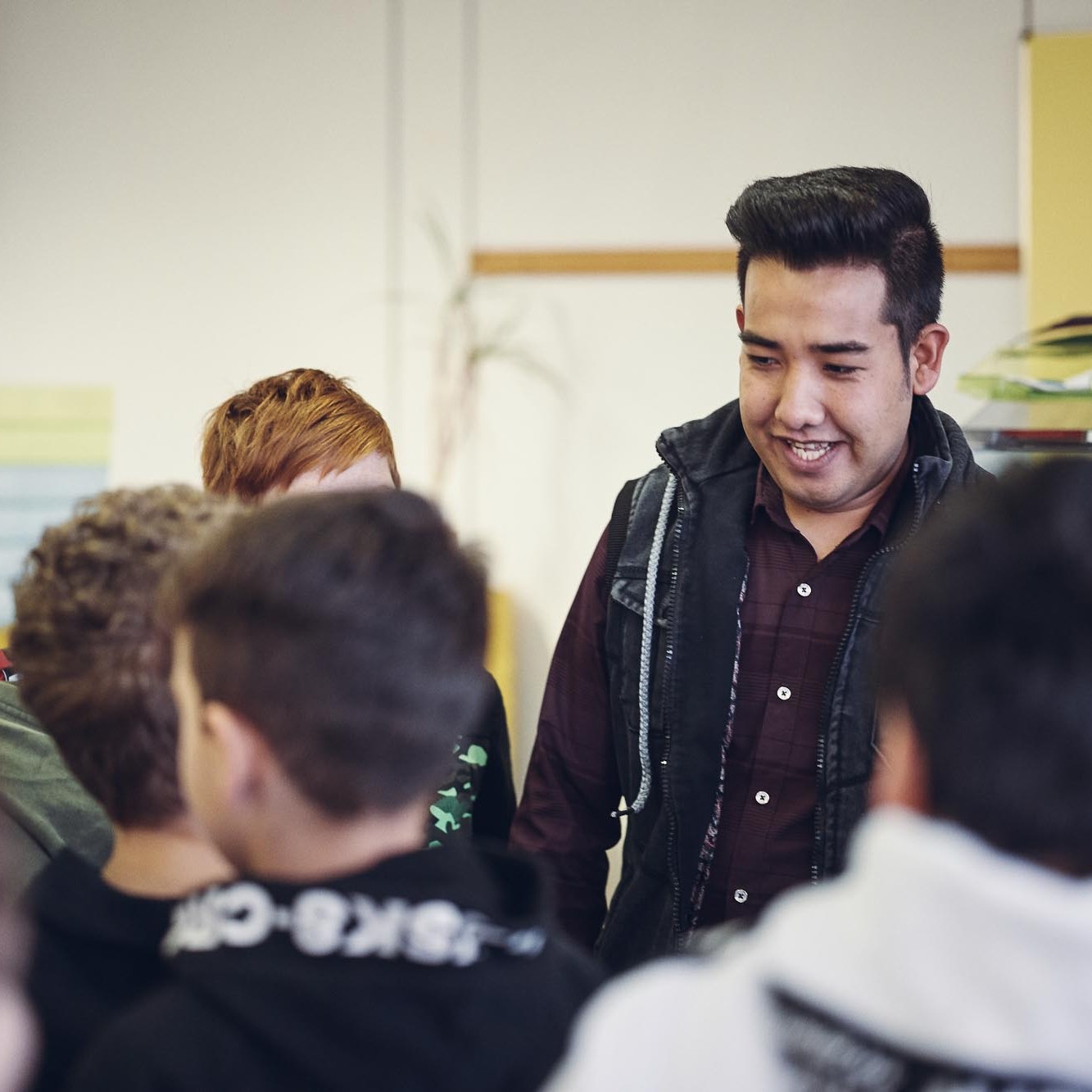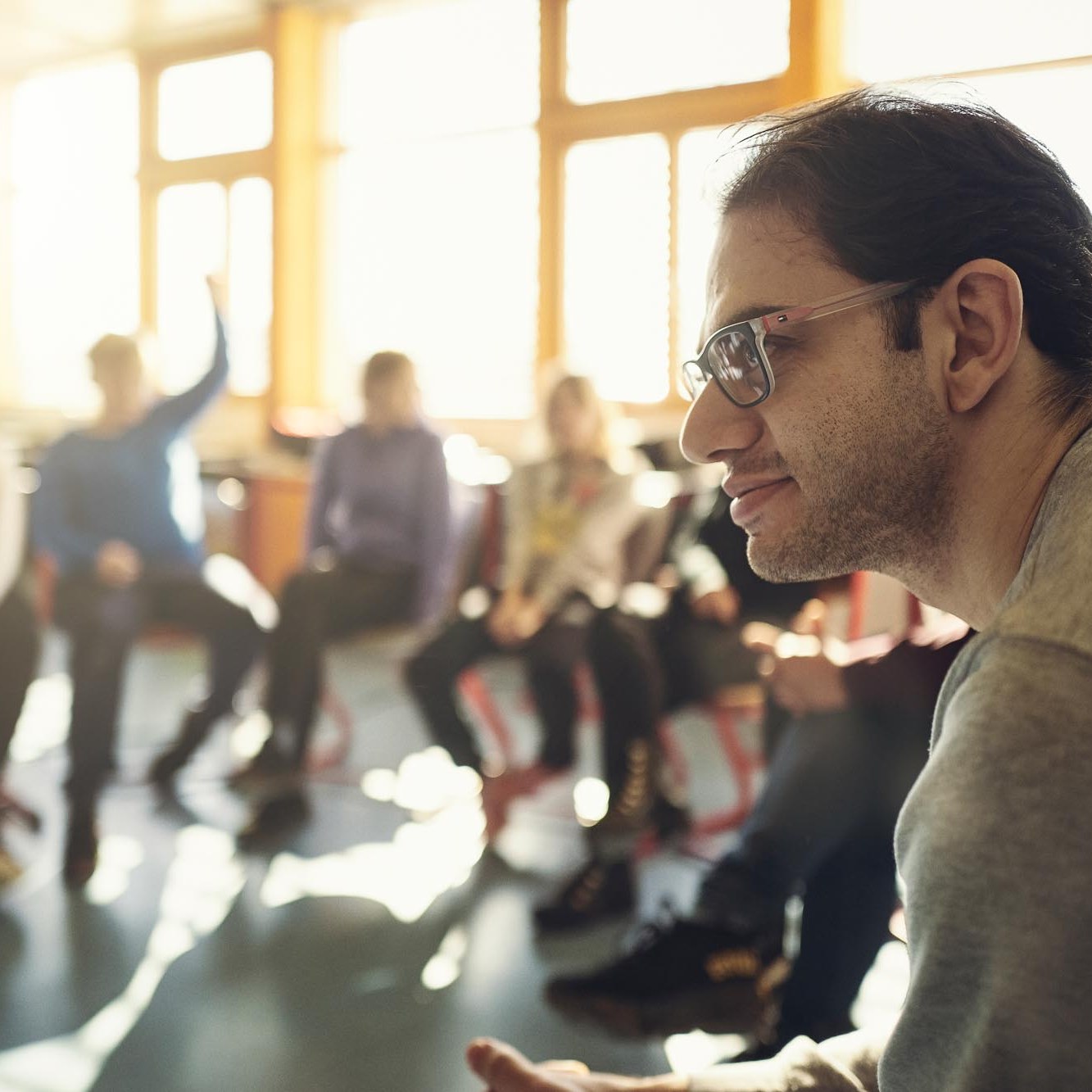 Der Fokus liegt auf dem sich daran anschließenden Austausch in Form eines offenen Gesprächskreises in dem meist 1-2 Geflüchtete Fragen beantworten und von ihren Erlebnissen erzählen.